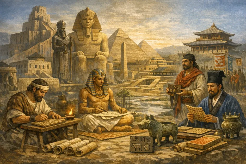 - Mésopotamie : développement ancien de l’écriture cunéiforme, d’abord liée à des usages administratifs et économiques, puis étendue à d’autres domaines ;
