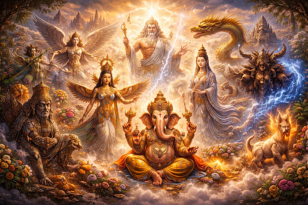 Après avoir étudié les arts funéraires et la mémoire des morts, il faut maintenant se tourner vers un autre domaine fondamental de l’art antique : la représentation de ce qui dépasse l’humain ordinaire. Les sociétés anciennes ne peuplent pas seulement leurs images de souveraines, de souverains, de prêtresses, de prêtres, de guerrières, de guerriers, de familles, de morts ou d’animaux familiers. Elles y font aussi apparaître des dieux, des déesses, des ancêtres puissants, des esprits, des génies protecteurs, des monstres, des hybrides, des gardiens, des puissances astrales, des êtres du chaos, des médiatrices et médiateurs entre mondes visibles et invisibles.